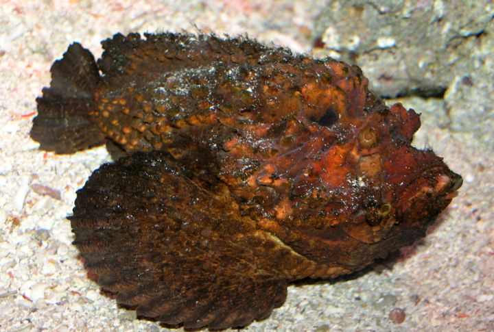 On the ocean floor, the stonefish becomes nearly invisible and blends seamlessly with its surroundings. Its venomous spines inject toxins that can cause tissue damage and extreme pain. Reportedly, it can survive 24 hours out of water, making accidental encounters on rocky beaches even more common.