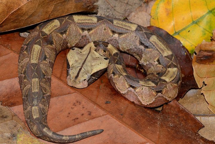 Camouflage reaches perfection with the Gaboon viper, whose leaf-patterned scales render it nearly invisible on forest floors. Native to African jungles, this snake has the longest fangs of any serpent, delivers strong venom and strikes with precise timing.