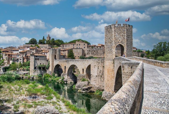 Besalu’s medieval bridge spans the Fluvia River and leads into a well-preserved historic center. The 12th-century mikveh remains one of Spain’s rare Jewish ritual baths. Its former Jewish quarter retains its original layouts and structures, providing a direct look into Catalonia’s medieval religious and architectural history.