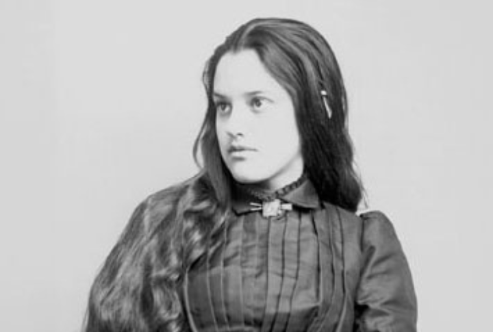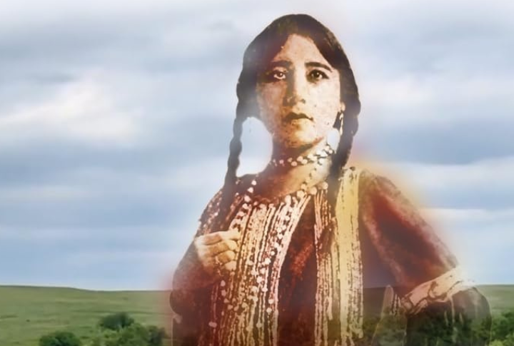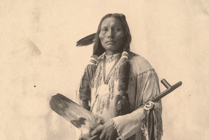 A Kiowa teen girl’s portrait from 1892 expresses the beautiful synthesis of nature, tradition, and emerging modernity. She is holding an arrow, has long hair, and displays intricate accessories and period attire. The girl truly reflects her cultural pride and evolving identity.