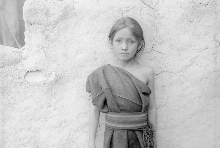 Depicted here is a young Hopi Indian girl outside in Oraibi, Arizona, circa 1900. She is dressed in traditional attire with her left shoulder bare and a striped band cinching her waist; she leans against an adobe wall. Her barefoot stance and thoughtful expression reveal the Hopi’s way of life.